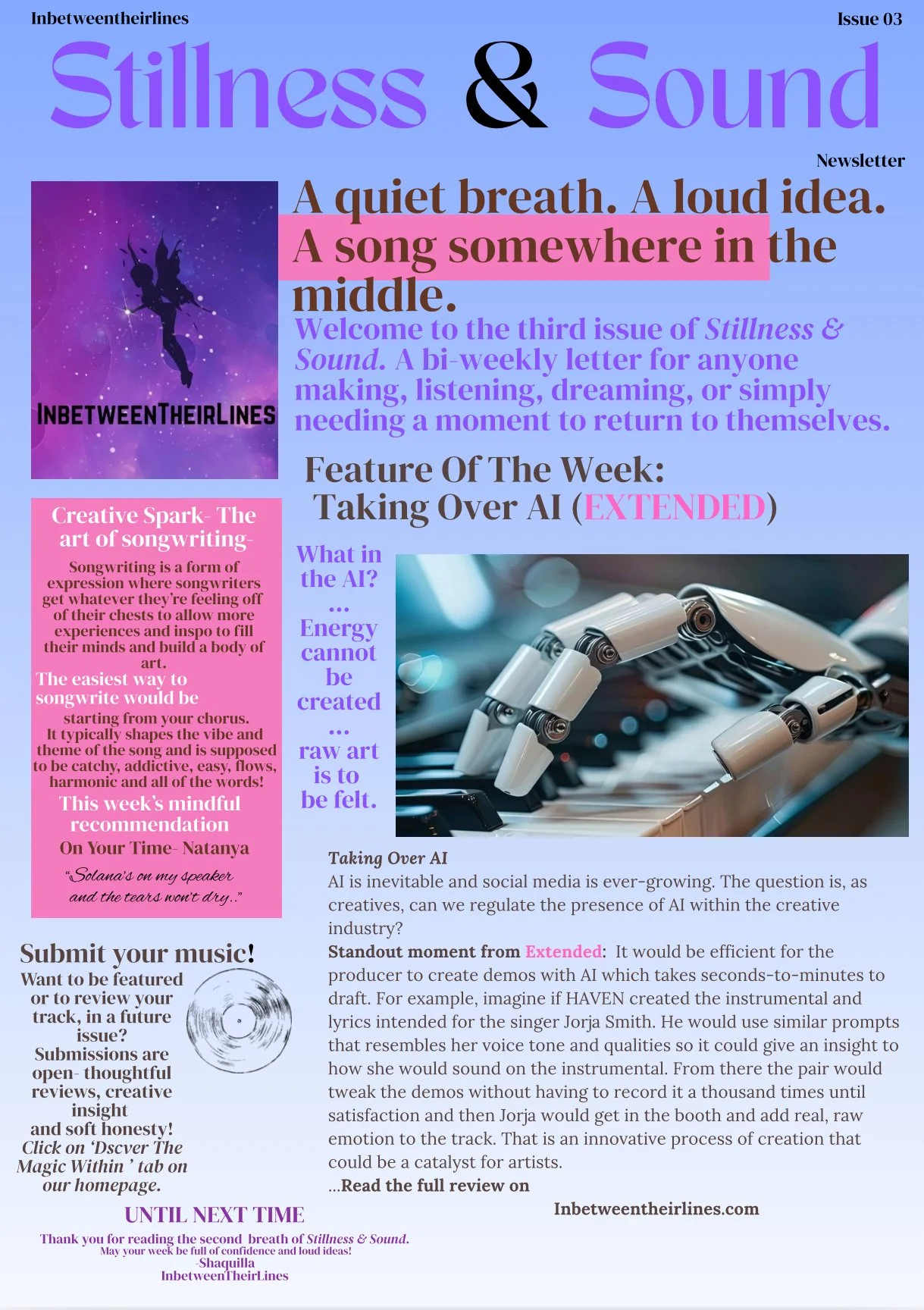 Subscribe to receive new weekly letters filled with music reviews, creative sparks, and mindful resets- straight to your inbox.